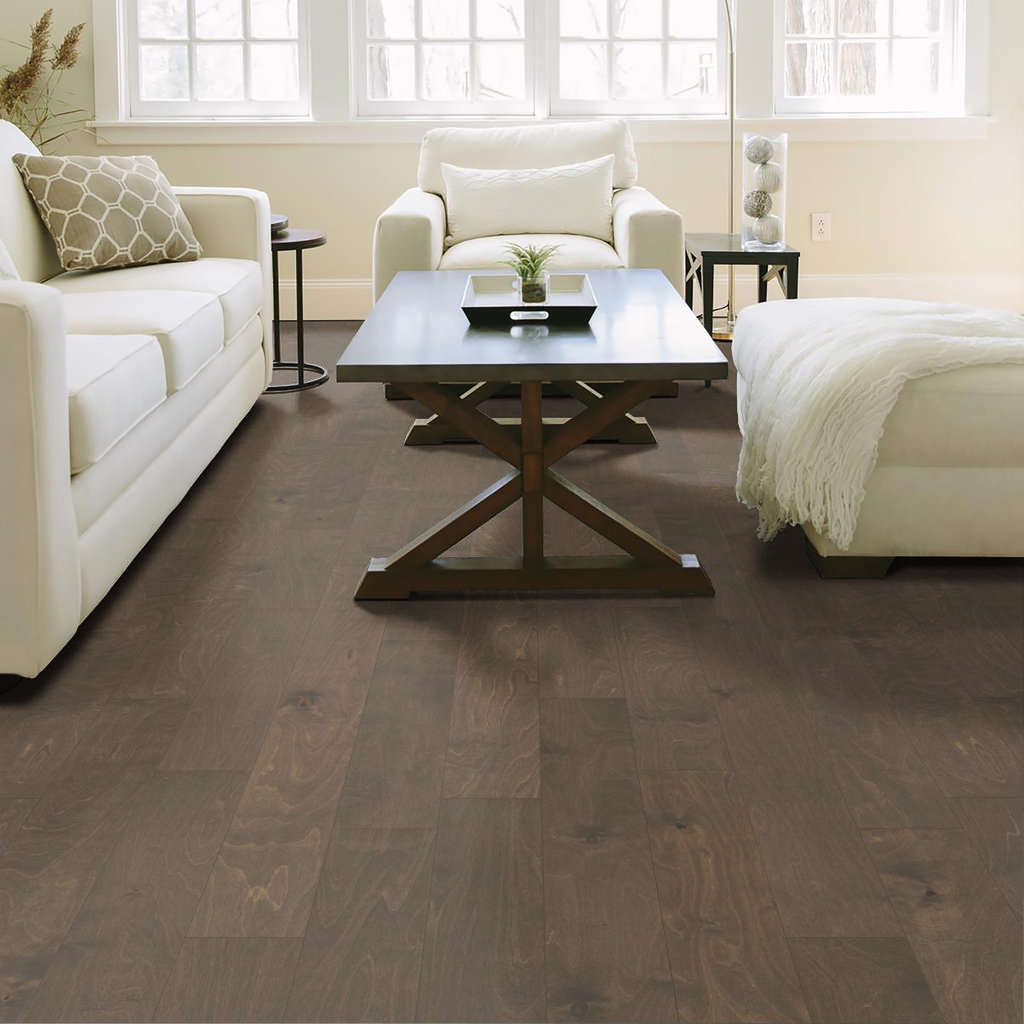 In this "artisan-crafted" style the scrape combined with gentle chatter, creates a versatile product that has refined, rustic appeal. Subtle birch grain adds to the casual charm, as does the matte finish, which gives a natural, oil-rubbed appearance—a hot designer look! Made with a 6-ply plywood core, planks have micro-beveled ends and edges and come in random lengths
